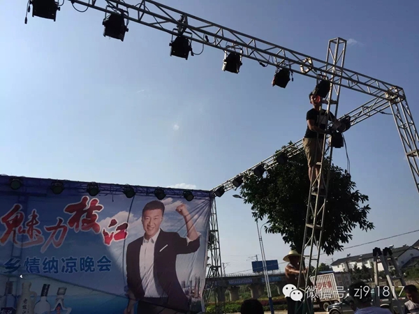 工作人员冒高温准备演出现场